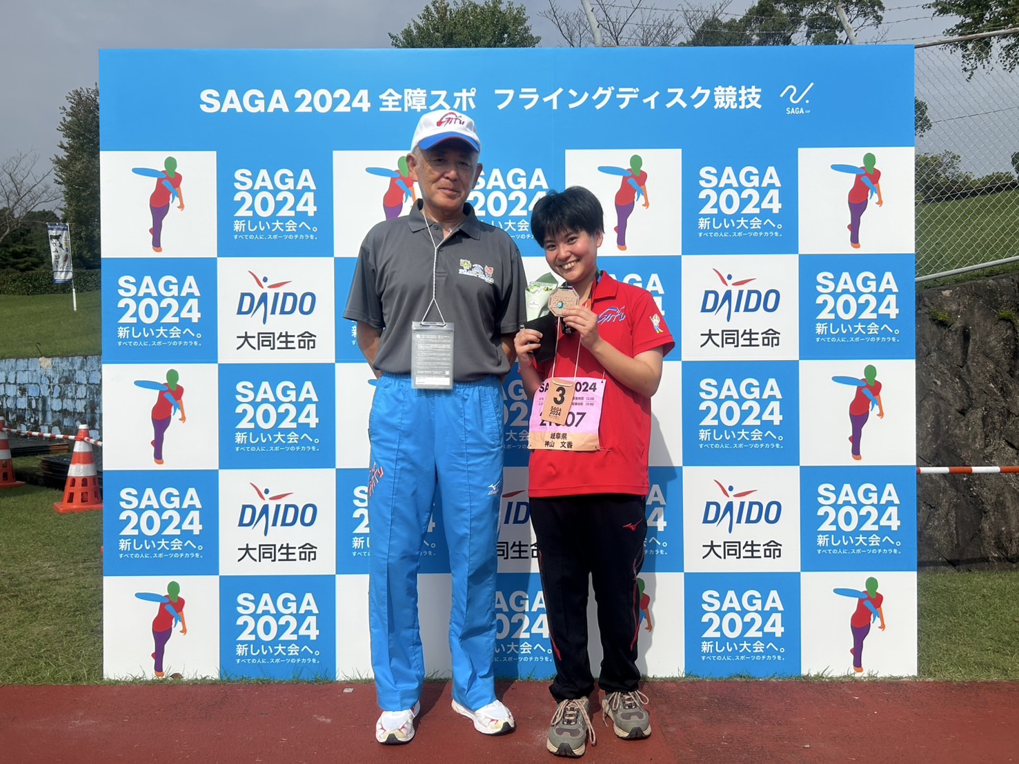 2024.11.22 清流園 第 23 回全国障害者スポーツ大会「SAGA2024」 に参加しました。 施設情報 10 月 26 日(土)~28 日(月) 佐賀県伊万里市国見台陸上競技場にて開催された、第 23 回全国障害者スポーツ大会「SAGA2024」フライングディスク競技大会に参加しました。 結果は、見事に銅メダルを獲得! 日頃の練習の成果が出たのではないでしょうか。 神山文香さん、おめでとうございました(^^♪
