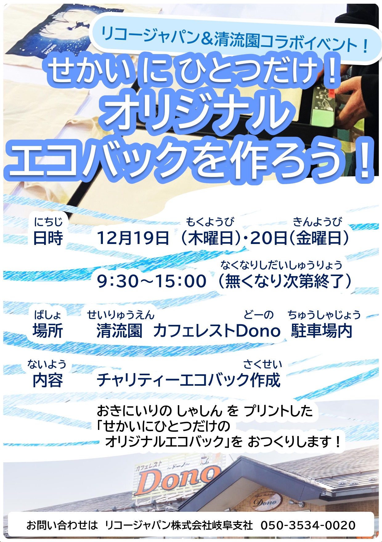 また、19日(木)20日(金)は、リコージャパン株式会社岐阜支社さんとのコラボイベント、「せかいにひとつだけ!オリジナルエコバックを作ろう!」と題しまして、チャリティーエコバッグの作成イベントを開催します。