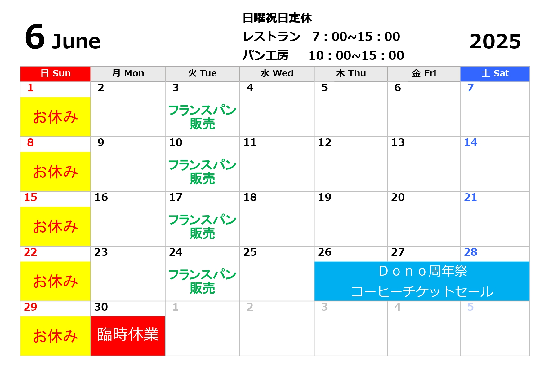 2025.05.19 清流園 ☆彡 6月営業日カレンダー ☆彡 施設情報 いつもカフェレストドーノ・パン工房ドーノをご利用いただき誠にありがとうございます。 6月の営業日カレンダーをお知らせします。 6月は周年祭も開催いたします。 皆様のご来店をスタッフ一同お待ちしております。