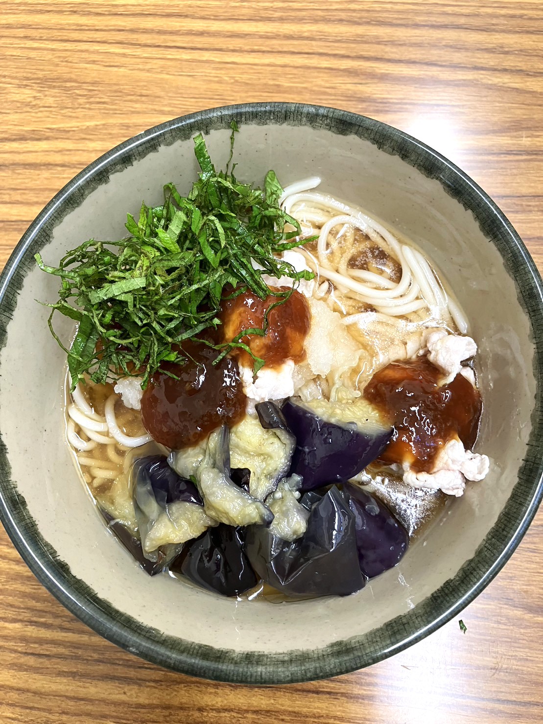 さっぱりとしたおろしと、食欲をそそる豚しゃぶの組み合わせが絶品でした。写真は職員が持参した大葉をトッピングした一杯です。