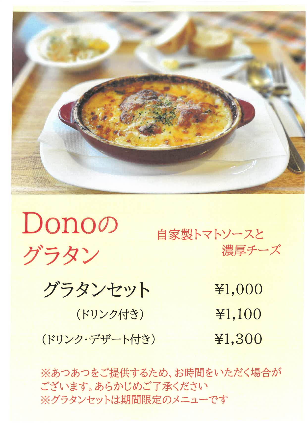 2025.11.17 清流園 ☆彡 季節限定グラタン、始まります! ☆彡 施設情報 今年の冬も、ドーノ特製グラタンを始めました。 出来立てアツアツの美味しいグラタンを、ぜひご賞味ください。 季節限定メニューとなっておりますので、お早めにどうぞ! 皆さまのお越しを心よりお待ちしております。