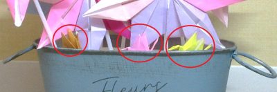 花の下にいる折り鶴は、自分とご両親に見立てて作ったそうです。