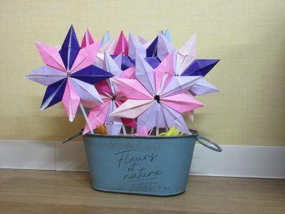 好きな色の折り紙を選び、1ヶ月ほどかけて居室や作業室でコツコツと作成をしました。
