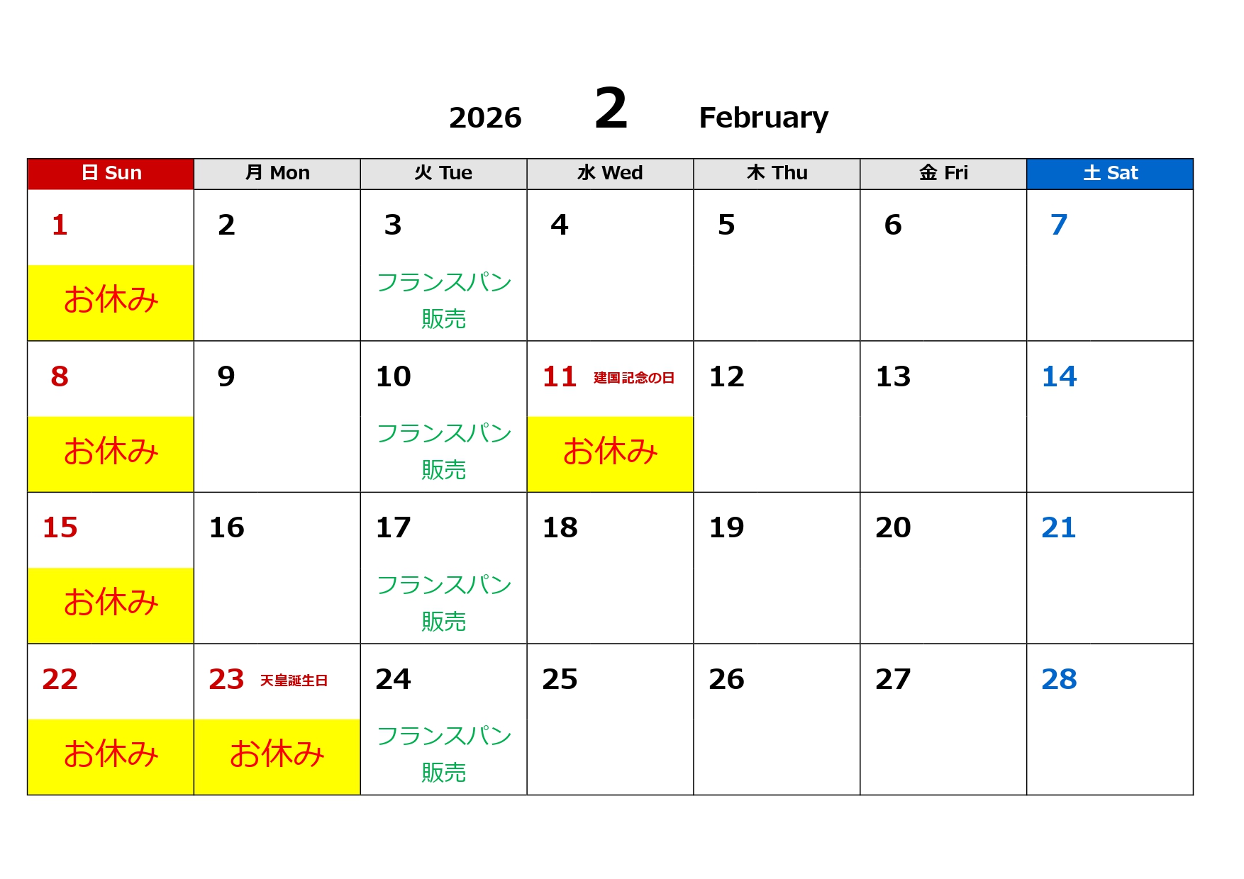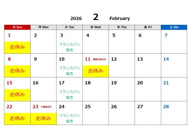 2026.01.28 清流園 ☆彡 2月営業日カレンダー ☆彡 施設情報 いつもカフェレストドーノ・パン工房ドーノをご利用いただき、ありがとうございます。 2月の営業日カレンダーをお知らせします。 多くのお客様のご来店をスタッフ一同お待ちしております。