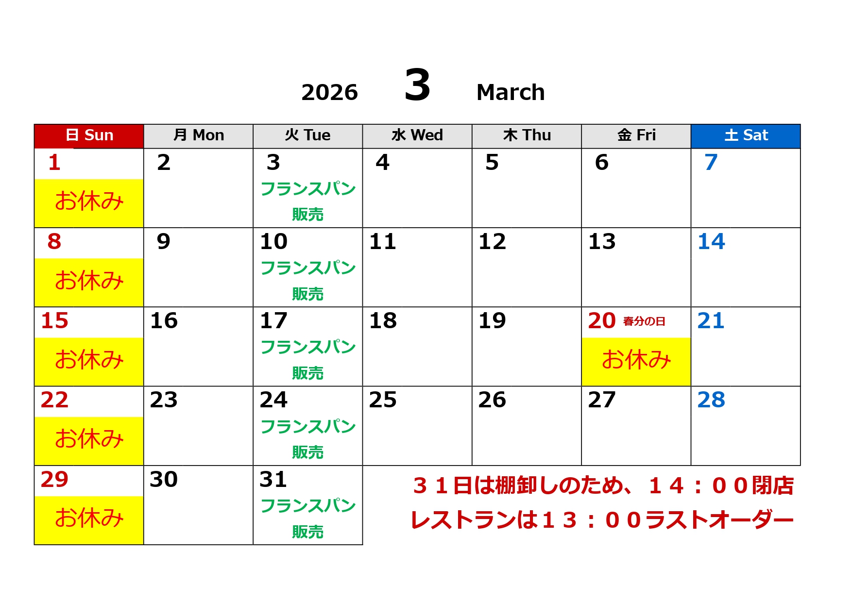 2026.02.26 清流園 ☆彡 3月営業日カレンダー ☆彡 施設情報 いつもカフェレストドーノ・パン工房ドーノをご利用いただきありがとうございます。 3月の営業日をお知らせします。 スタッフ一同、皆様のご来店を、心よりお待ちしております。