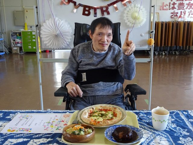 2026.04.09 陽光園 バースデー会♪ 施設情報 4/8(水)、4月生まれの方のバースデー会を行いました。 利用者様に予め希望メニューを伺って、一緒に食事を 召し上がりました。 ハンバーグにピザ、大好きなものをお腹いっぱい食べました!