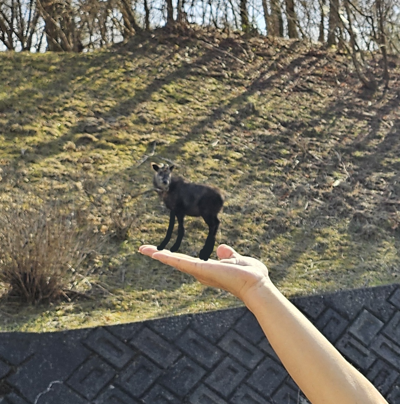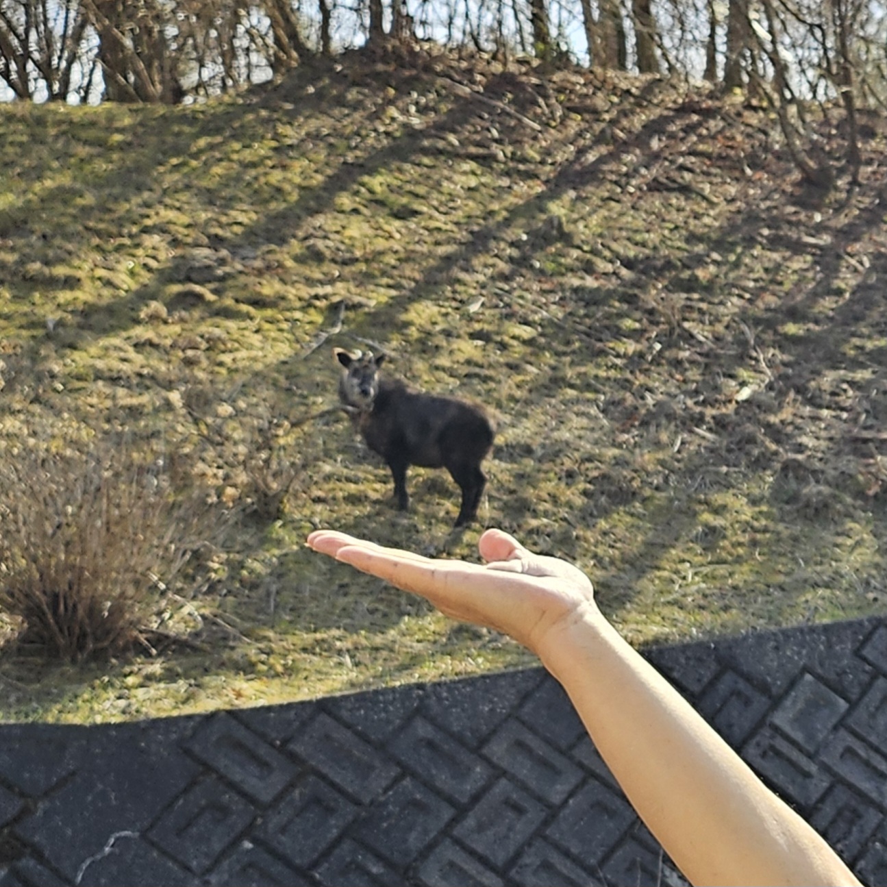 2025.03.16 サニーヒルズみずなみ 越冬のカモシカ その他 3/14カモシカの親子が山を下りて来ました。 2月は雪が降ったりとても寒かったですが、無事に冬を越せたようです。 写真で見るより間近に感じましたね。 手乗りチャレンジ ちょっと浮いていたので脚を伸ばしておきます。 簡単に加工できる時代でおもしろいですね。 ですがフェイク動画などには気をつけましょうね。