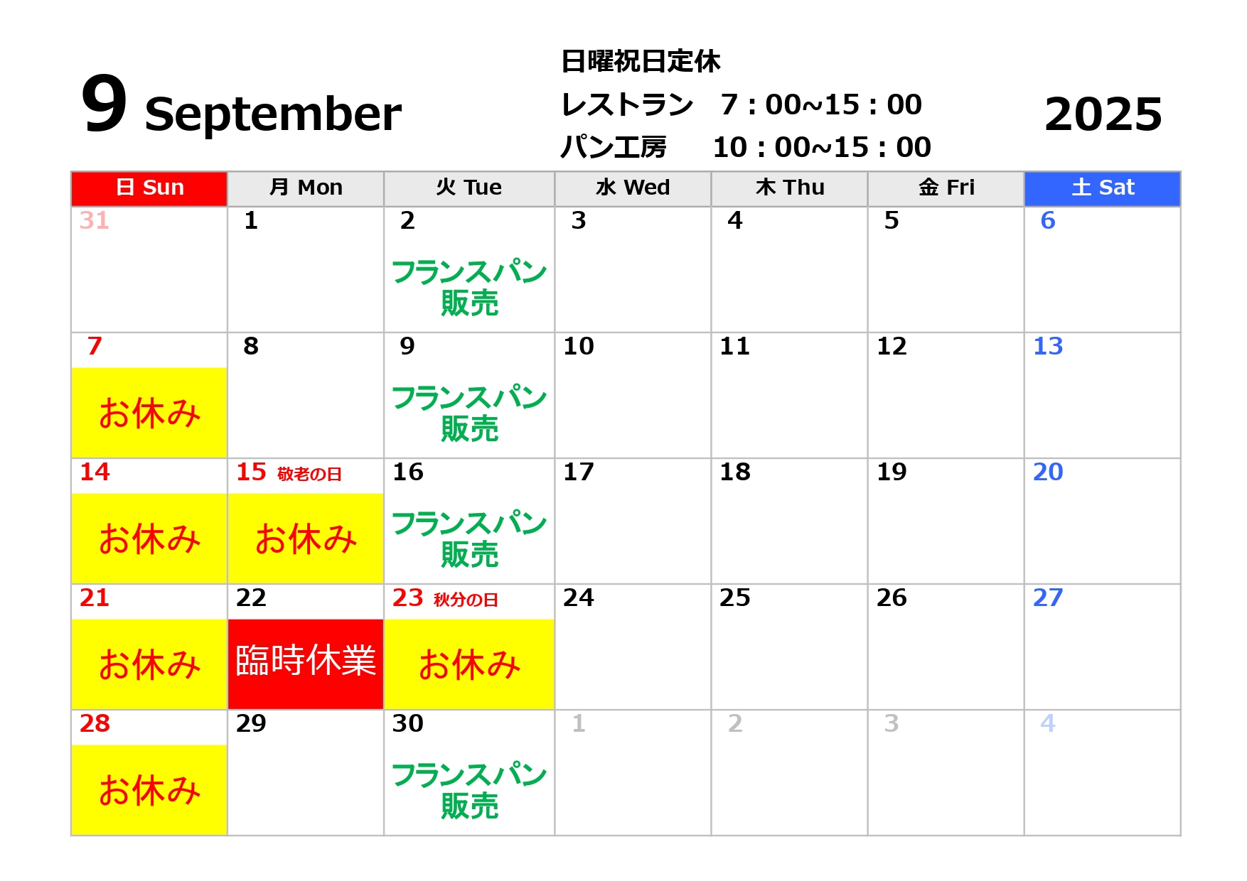 2025.08.22 清流園 ☆彡 9月の営業日カレンダー ☆彡 その他 いつもカフェレストドーノ・パン工房ドーノをご利用いただきありがとうございます。 9月営業日カレンダーをお知らせいたします。 皆様のご来店をスタッフ一同、心よりお待ちしております。